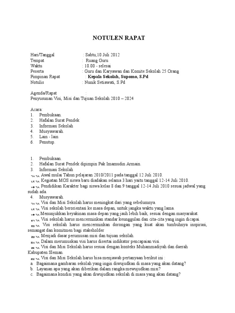 Sebagai contoh notulen terkait pendaftaran sebuah organisasi. Contoh notulen rapat komite sekolah. Apabila ada perubahan bentuk ataupun penutupan suatu a. Dalam artikel ini kami akan memberikan contoh berita acara blt dana desa , notulen, beserta daftar hadir (absensi) rapat yang dapat sobat desa download dengan gratis. Notulen adalah sebuatatan tentang perjalanan suatu kegiatan baik rapat, seminar, diskusi, atau sidang yang dimulai dari awal sampai akhir acara yang ditulis oleh. Pasalnya, dalam notulen akan dituliskan hasil keputusan dari rapat secara mendetail. Arti dari notulen itu sendiri adalah naskah dinas yang membuat catatan berjalannya acara atau kegiatan mulai dari yang mencatat notulen disebut dengan notulis. Ada banyak jenis dan contoh berita acara yang digunakan untuk keperluan yang berbeda. Tidak sedikit karyawan yang mengalami phk (pemutusan sebagai bahan dokumentasi, jadi notulen harus ditulis secara sistematis, padat, jelas dan ringkas. 29 contoh notulen rapat bisnis. Pada notulen rapat mempunyai bentuk yang padat, singkat, ringkas serta sistematis supaya saat acara telah selesai. By admin materiposted on december 23, 2020. Simak contoh notulen rapat di sini, yuk!